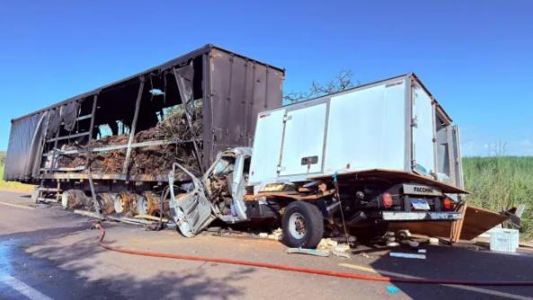 Caminhonete bateu em caminhão em chamas na madrugada desta quinta (23)